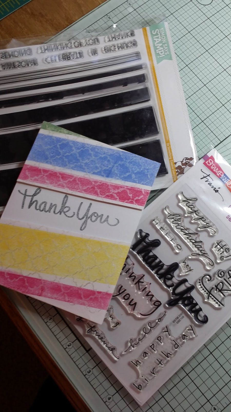- I used the Jumbo Stripes from Simon Says Stamps and used Fuchsia, Buttercup, Seafoam and Hydrangea chalking ink from Powderpuff. I guess we have to learn from trying right? I see now that I should've used a different ink. Chalk ink dries so fast and I had to re-stamp several times to get the coverage I wanted.